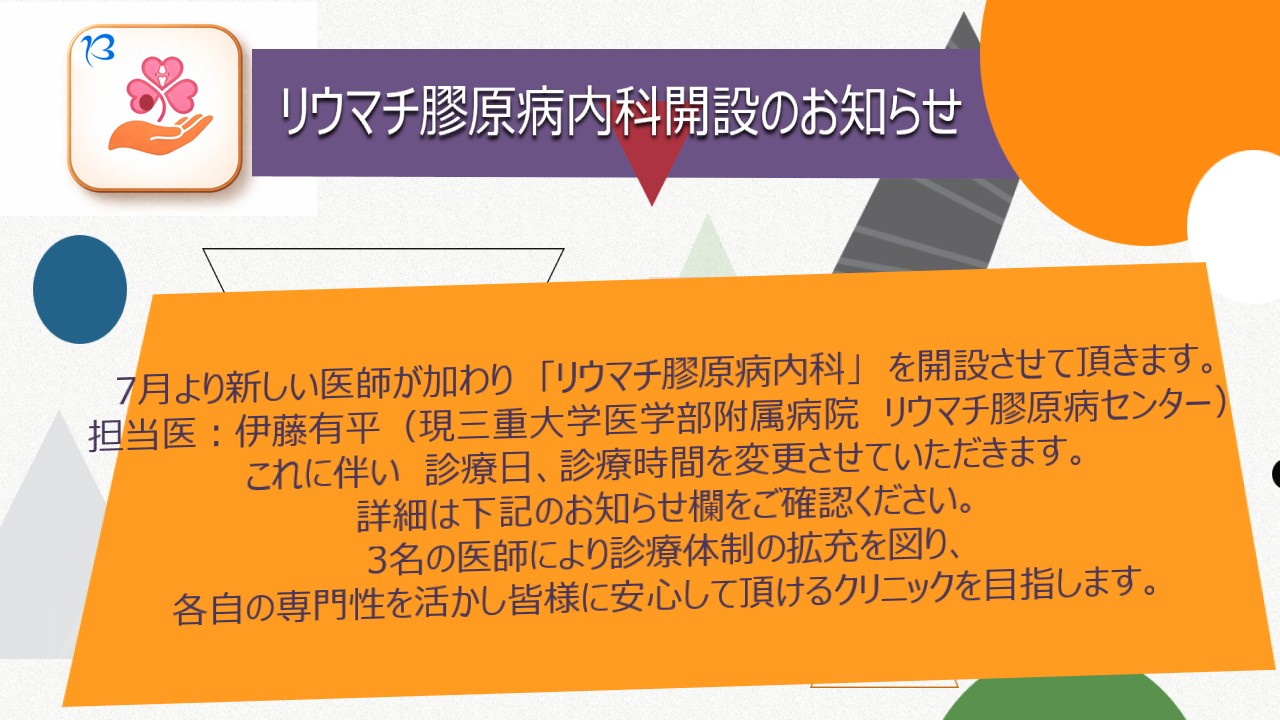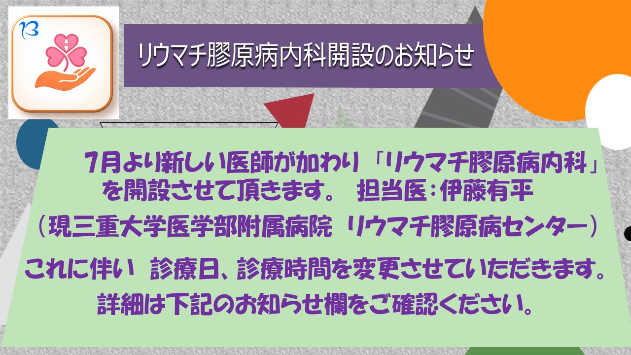 | 2026年4月19日 | リウマチ膠原病内科開設のお知らせ |