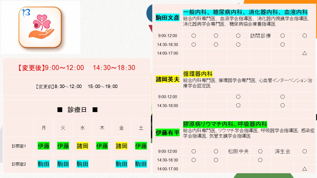 7月1日より新しい医師:伊藤有平(現三重大学医学部附属病院リウマチ膠原病センター所属)が赴任します。リウマチ膠原病や呼吸器内科の専門医です。リウマチや膠原病は、免疫の異常により関節や血管、皮膚、内臓などに炎症が起こる病気ですが、早期に発見し、適切に治療を行うことで、症状の進行を抑え、日常生活を良好に保つことが可能です。新しいお薬もどんどん登場し治療も飛躍的に進歩しています。かいばな内科は、これから3名の医師が各自の専門性を活かし、診療の質を高め地域医療レベルの向上に貢献していきたいと考えております。なおこれに伴い添付のように7月1日より診療曜日、時間に変更が生じますが何卒ご理解の程お願い申し上げます。